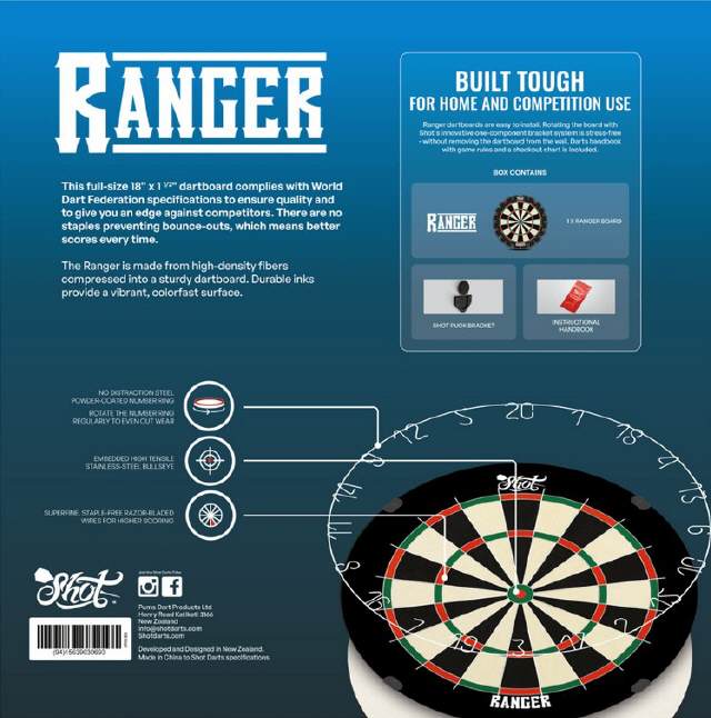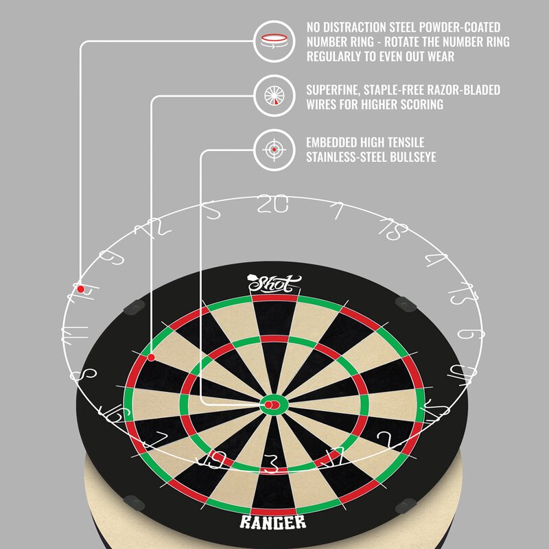 Das selbstheilende Ranger Bristle Dartboard ist robust gebaut und garantiert ein hochwertiges Spielerlebnis. Mit der klammerfreien Technologie für weniger Bounce-outs, ist diese Dartscheibe für Spieler aller Spielstärken geeignet. Das eingebettete Bullseye des Rangers besteht aus hochfestem Edelstahl und ist stoßfest für ein längeres Spielvergnügen. Die superfeinen, klammerfreien Drähte wie Rasierklingen sorgen jedes Mal für höhere Trefferquoten.
