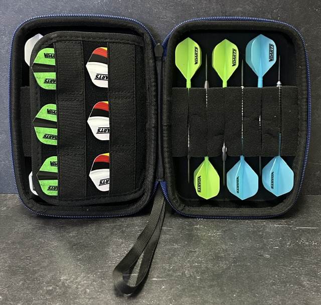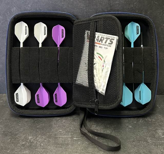 Unser X-Case MK2 im tollen schlichten Design aus EVA schützt deine Darts und dein Zubehör und ist zudem noch leicht zu reinigen. Das handliche Case ist mit einem hochwertigen Metallreißverschluss und einer Trageschlaufe versehen. Das Innere bietet Platz für 2 Satz montierte Darts, 2 Satz All-in-One-Flights und ausreichend Zubehör wie z.B. Spitzen, Shafts und Flights.